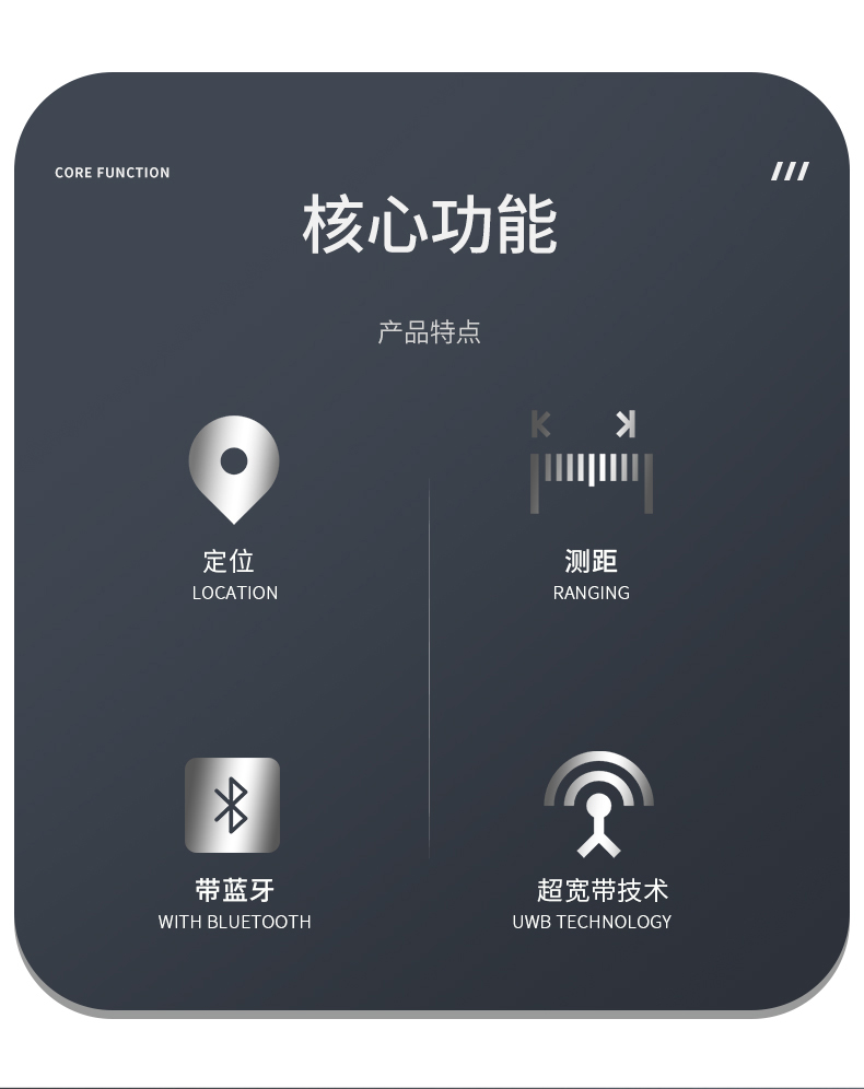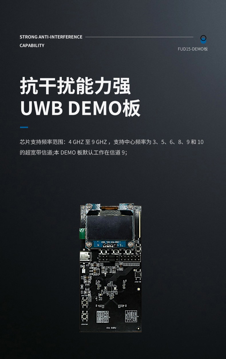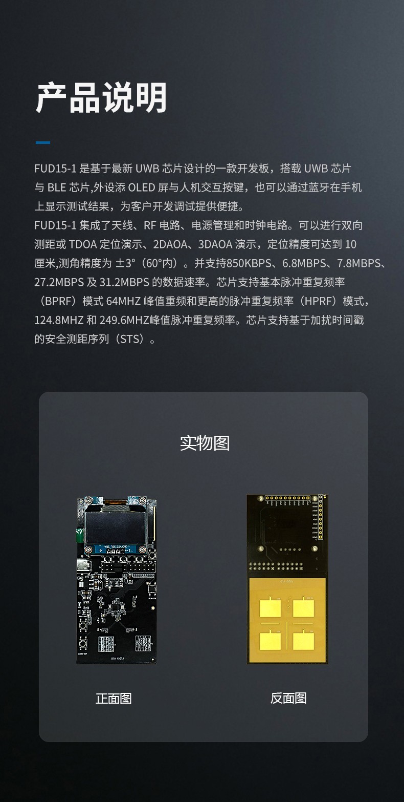 FUD15-1 是基于 UWB 芯片设计的一款开发板,搭载 UWB 芯片与 BLE 芯片,外设添 OLED 屏与人机交互按键,也可以通过蓝牙在手机上显示测试结果,为客户开发调试提供便捷。 FUD15-1 集成了天线、RF 电路、电源管理和时钟电路。可以进行双向测距或 TDOA 定位演示、2DAOA、3DAOA 演示,定位精度可达到 10 厘米,测角精度为 ±3°。