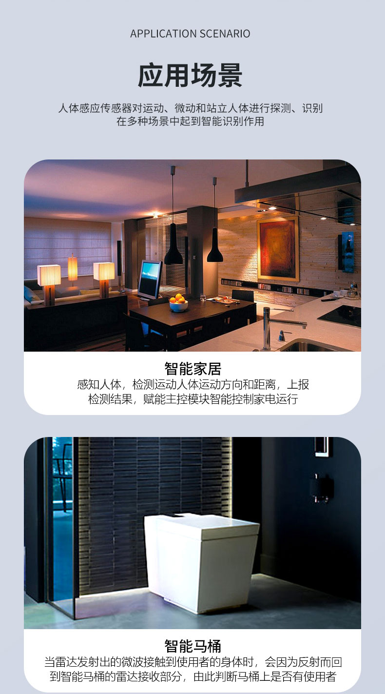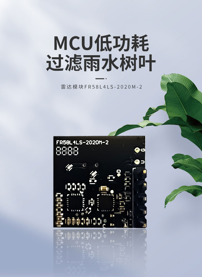 FR58L4LS-2020M-2 简称 2020M 是飞睿智能推出的高性能低功耗 5.8G 雷达传感器,雷达模块利用多普勒原理,通过天线发射高频电磁波并接收初期反射波,以此判断覆盖范围内物体的移动,给出相应电信号。模块尺寸 20*20MM,该模块集成了 5.8G 微波电路、中频放大电路以及信号处理器,集成度高且生产一致性好,模块内置32 位 MCU 和收发天线,大大提高了传感器的感应性能。雷达模块感应距离远、角度广、无死区、透镜和透镜老化问题不受温度、湿度、气流、灰尘、噪声、亮暗等影响。模块内植入滤雨树叶算法,能过滤掉雨水树叶的误触发,性能稳定,广泛应用于智慧照明、智慧安防等多个领域。